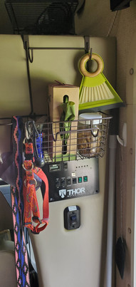 At the entry door is a side panel that is upholstered. I purchased a "blow-dryer" rack meant to hang on a cabinet door. This hangs over the panel and provides us a place for all of the doggie essentials.